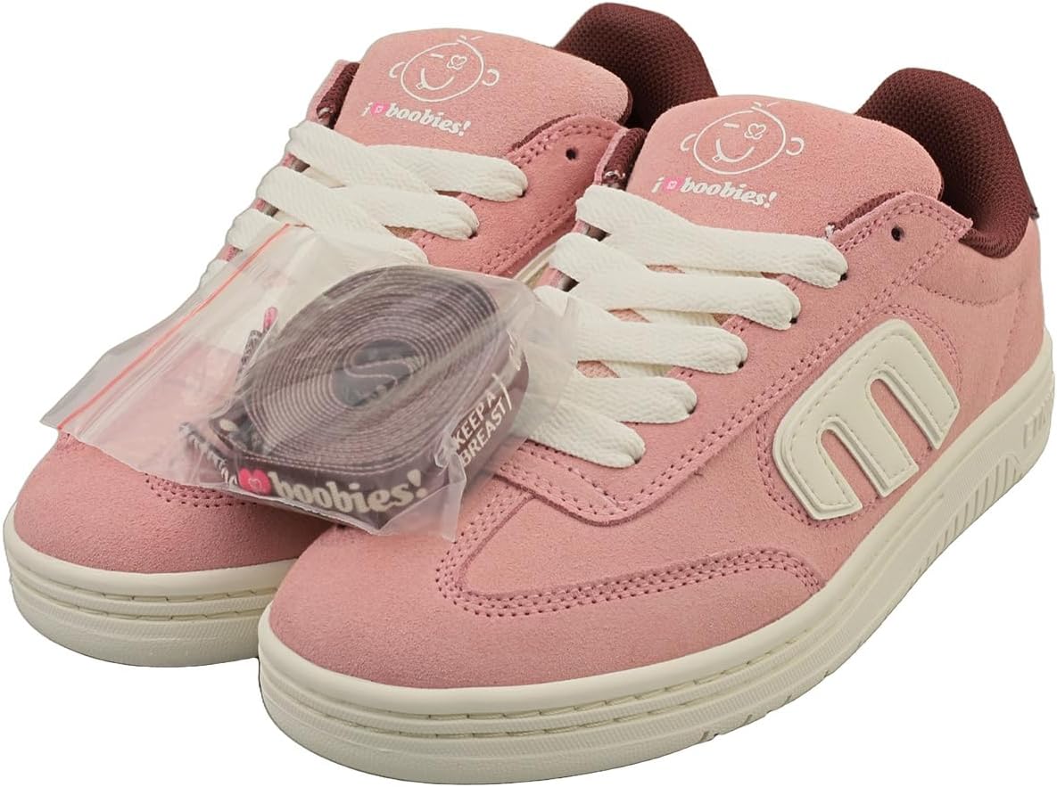 Etnies LOCUT X KEEP A BREAST trainers embody a vibrant energy and unwavering support. These women's skate trainers showcase a soft pink hue across a durable suede upper contrasted beautifully with synthetic detailing. Inside, a comfortable textile lining and insole cushion every step while a dependable rubber sole delivers reliable grip and lasting wear. Secured with traditional lace-up fastenings, they're built for performance and infused with a powerful message of hope and solidarity.