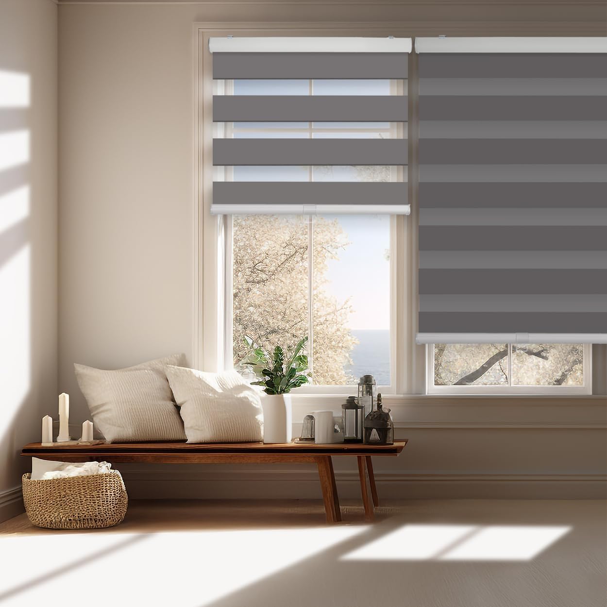 Blackout roller shades for indoor windows and privacy, Cordless zebra blinds for windows with smooth pull down operation, Custom size Room Darkening shades for bedroom windows and perfect fit, Dual layer roller window shades for day and night light control, Easy-to-install window blinds for home, kitchen, or office use |