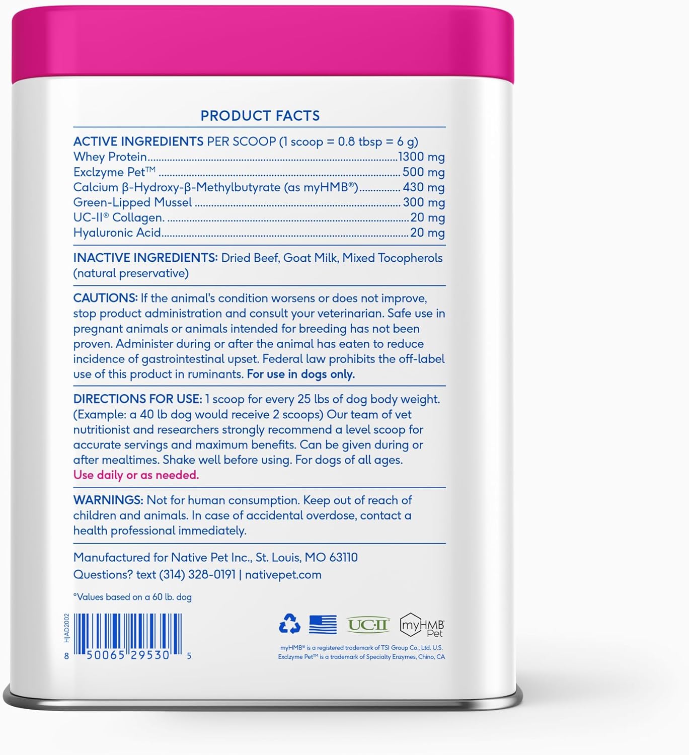 | Active Ingredients | Whey Protein, Exclzyme Pet™, Calcium β-Hydroxy-β-Methylbutyrate (as myHMB®), Green-Lipped Mussel, UC-II® Collagen, Hyaluronic Acid |
