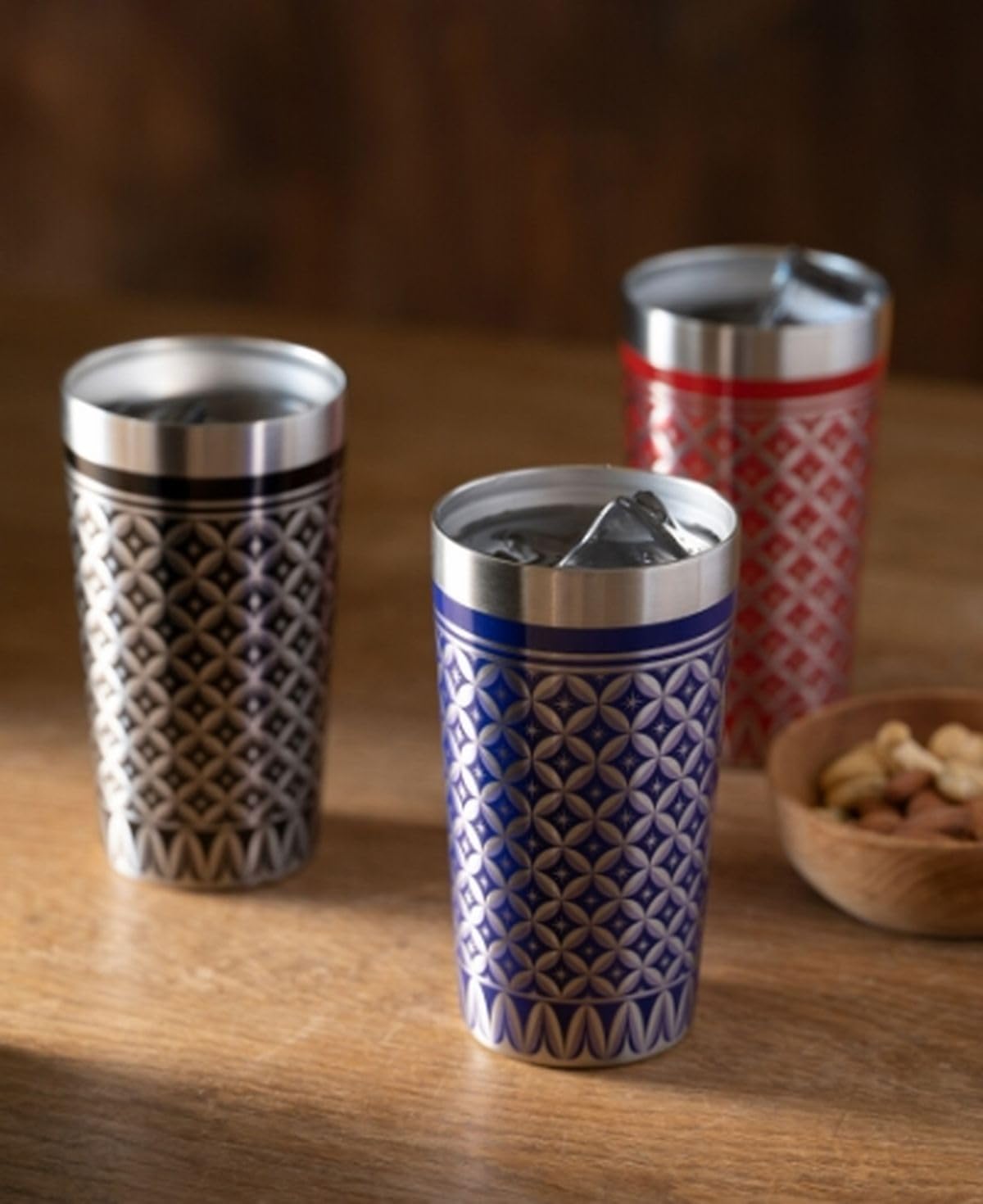 Double wall vacuum tumbler with traditional cloisonne pattern on stainless steel The circle is permanently interlocked and linked to this pattern is a result of a great accomplishment that involves wishes for sound, harmony, and borders.