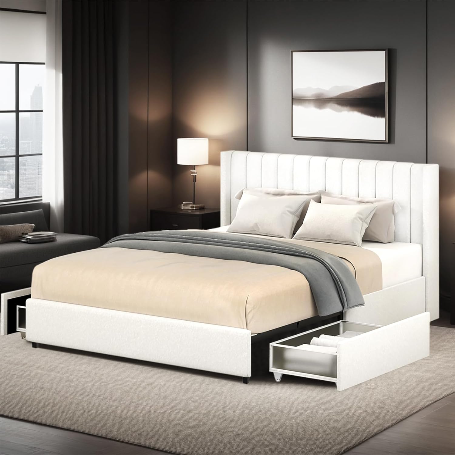 | Included Components | 2 Patented Metal-Framed Dust-Proof Drawers, Curved Stitched Tufted Boucle Headboard, Premium Natural Wood Slat System, Reinforced Steel Frame & Center Support Rails, Signature Ergonomic Ratcheting Wrench |