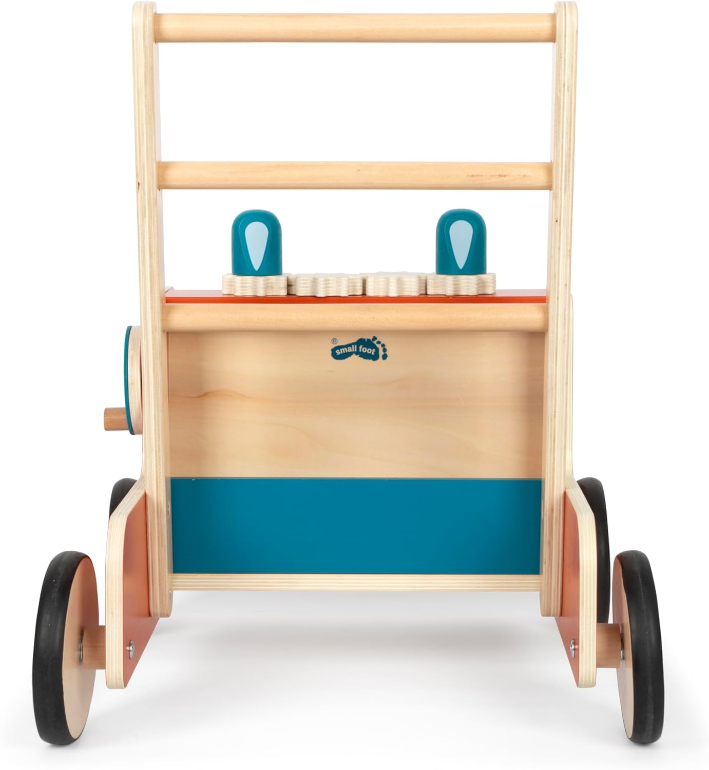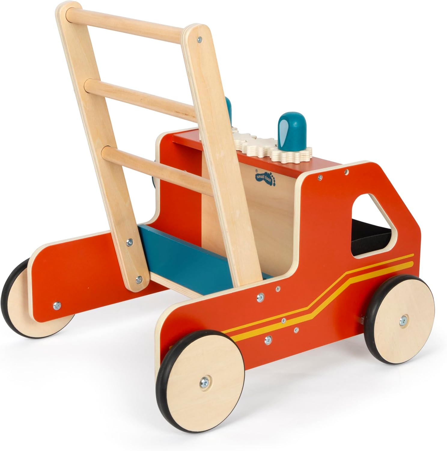 Taking big steps in the world of heroes who put out the fire! This robust walker made of high-quality wood is not only a toy, but also a faithful companion for those first steps. With its attractive fire truck design, it sparks imagination and invites children to embark on exciting adventures. Equipped with a practical felt basket that can be easily removed, it offers space for small treasures and toys. Thanks to the integrated braking system, it allows controlled pushing. The rubber wheels not only ensure quiet and safe movement, but also protect the floor surface. The continuous shaft ensures a stable hold and prevents the walker from tipping over. The highlight of this walker is the fascinating set of gear wheels on the top, which not only stimulates the senses, but also spins the two blue lights of the fire engine. For more fun playing and motor skills, the walker has a crank on the side.